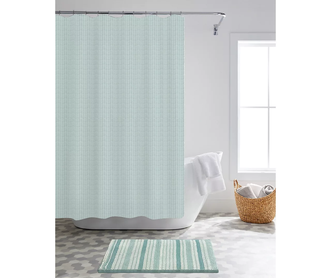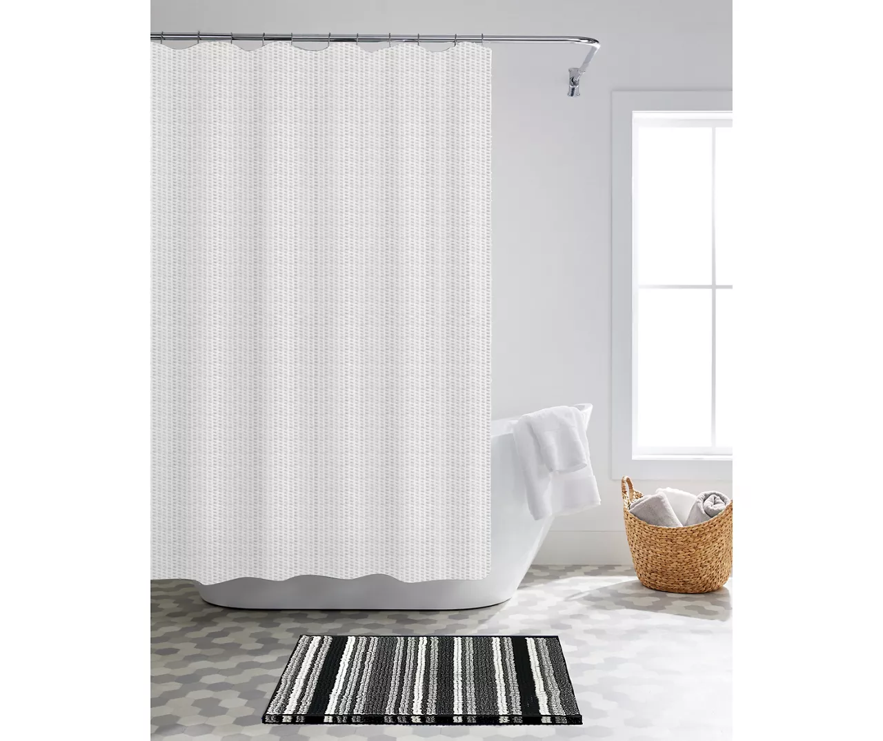 Give your bathroom a modern style refresh with this bath accessory set that comes with a textured shower curtain, 12 rollerbal hooks and plush noodle rug. The highly absorbent pile is soft and features a stripe design, and the rug comes with a non-skid backing to help keep it in place. Both the shower curtain and rug are machine washable, so you can easily keep your bathroom feeling fresh.