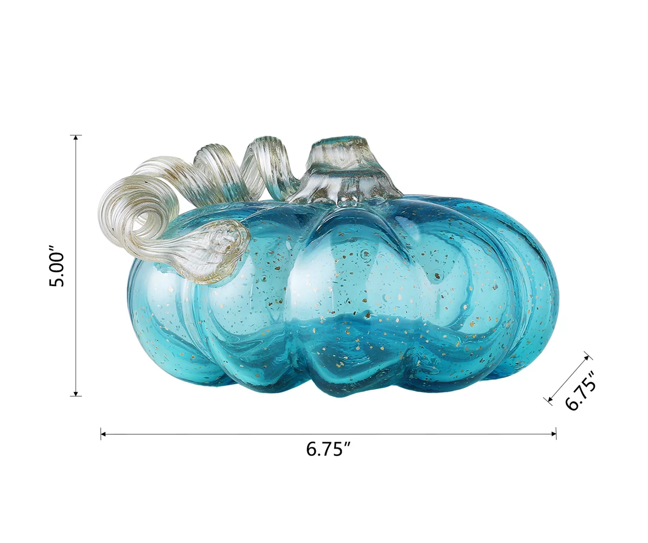 Adorn your home in stunning fall design using this glass pumpkin. Its hand-blow ribbed shape features a beautiful blue look with speckles of gold. Topped with a curly textured stem, it’s a marvelous addition to a mantel, table or shelf.
