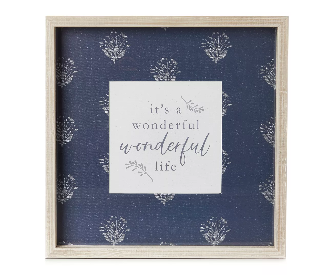 - White and blue floral print design in a natural antiqued frame