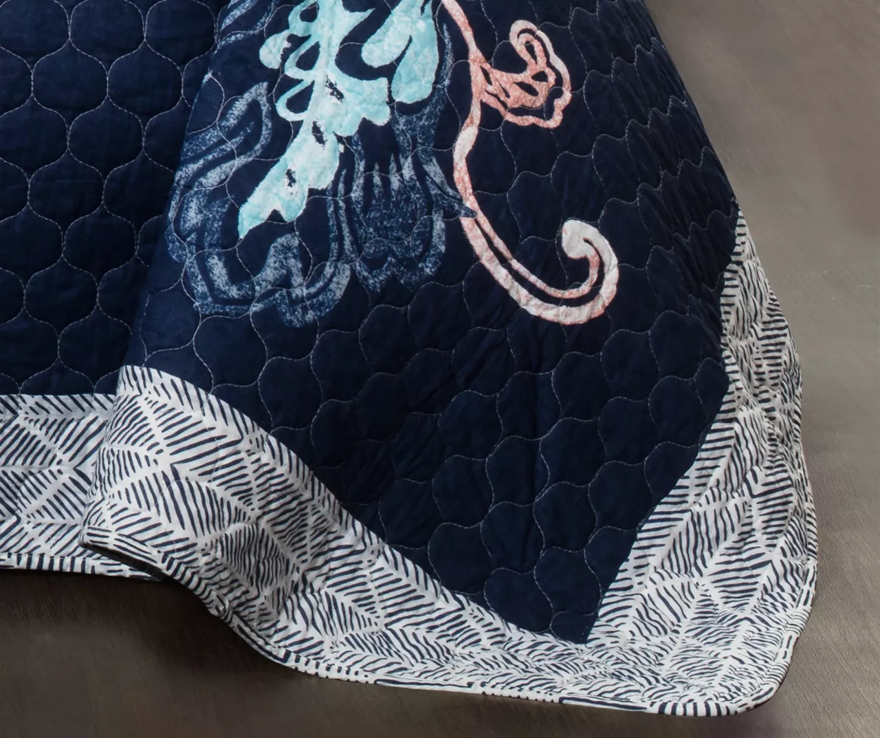 - Back side of quilt features a colorful botanical pattern