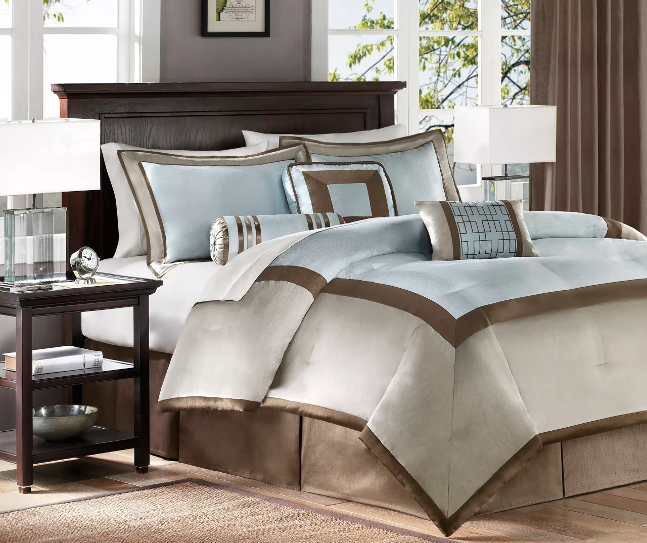 The Beverly bedding collection creates a neutral feel to your space with a nice light blue to add some color. This set is made from polyester polyoni creating a sheen to the brown, taupe and blue colorways in this bed. The taupe color creates a large border around the edge of the comforter and a brown border is used inside to give the blue a pop in the center. The decorative pillows make use of these same borders and colors for a completely matching set while the chocolate brown bed skirt adds some drama with its dark coloring. With these neutral colorways and large borders, this set will be easy to accessorize in any room in your home.