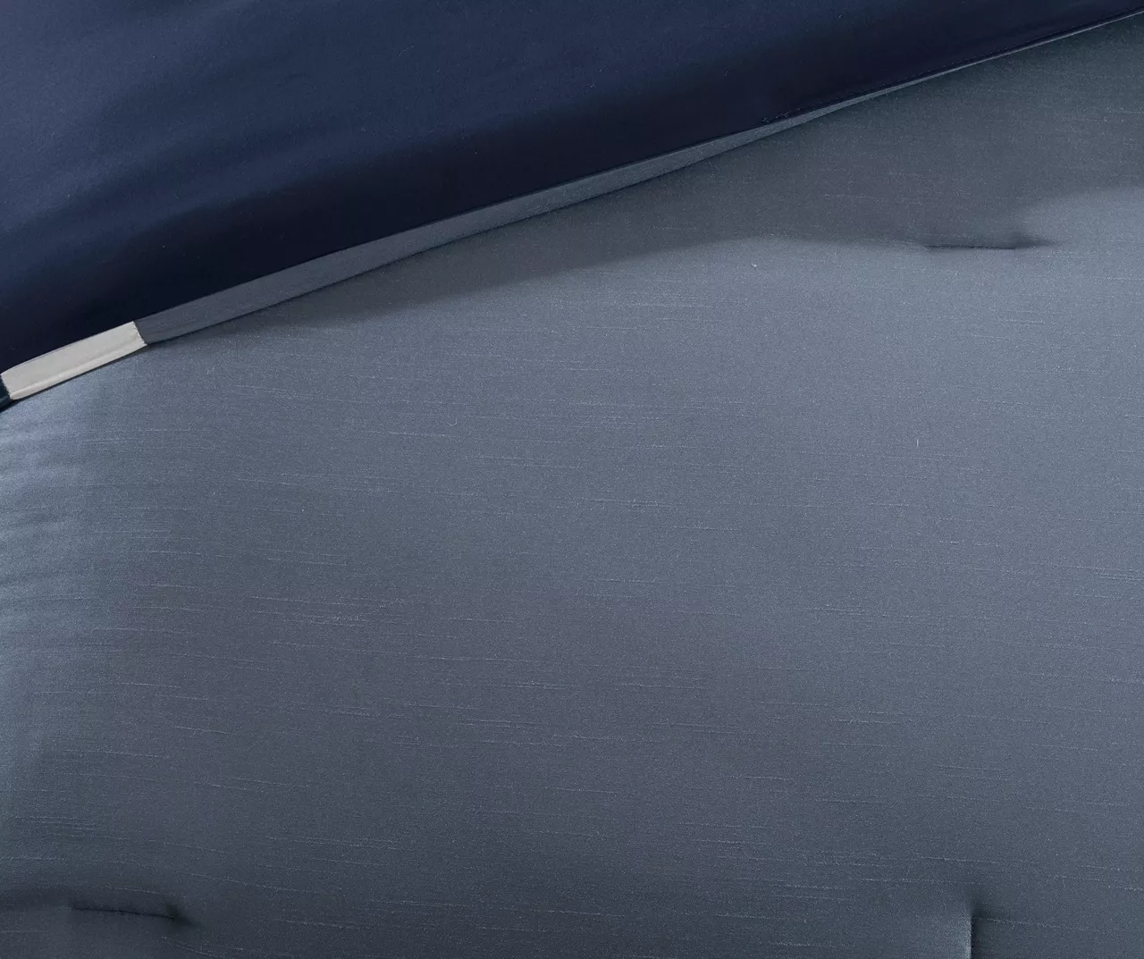 The Beverly bedding collection creates a neutral feel to your space with a shades of blue. This set is made from polyester polyoni creating a sheen to the navy, silver and blue gray colorways in this bed. The deep navy color creates a large border around theedge of the comforter and a silver border is used inside to give the blue-gray a pop in the center. The decorative pillows make use of these same borders and colors for a completely matching set while the navy bed skirt adds some drama with its dark coloring. With these neutral colorways and large borders, this set will be easy to accessorize in any room in your home.
