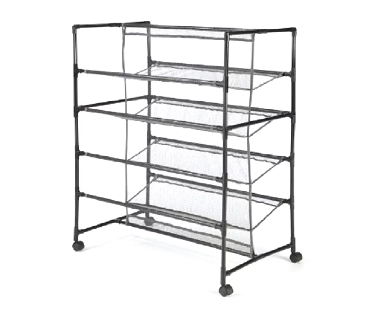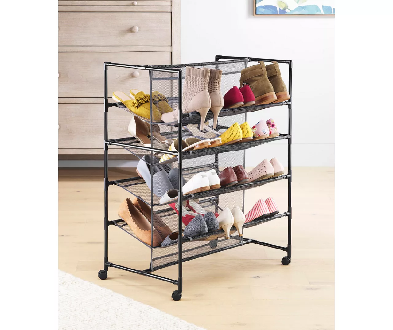 Whitmor’s four-tier dual-sided shoe rack can hold up to 30 pounds or 24 pairs of shoes. The mesh-lined backing prevents shoes from falling out and the durable metal frame is easy to assemble, with tools included. Four casters on the bottom make it easy to move around when needed or lock in place.
