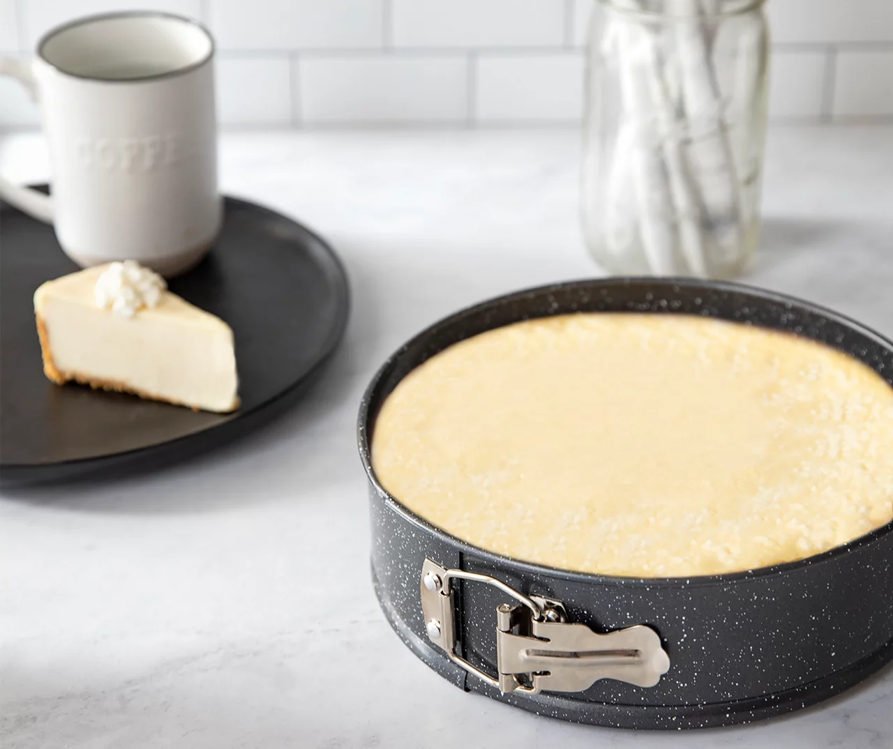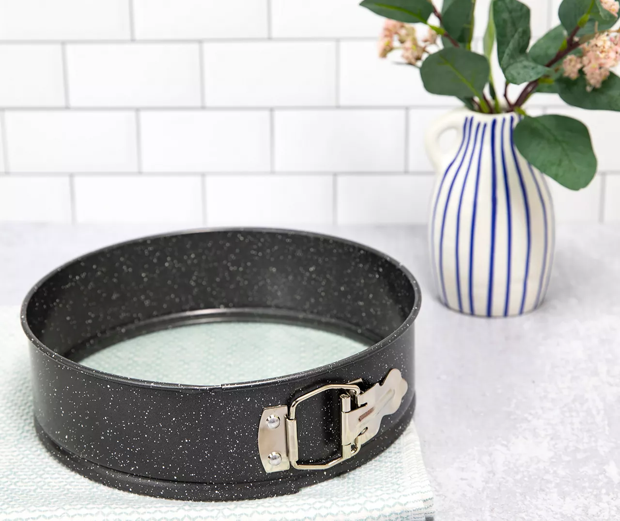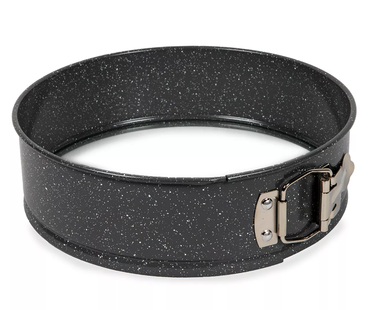 Bake the treats of your dreams with this stylish springform pan. The buckle provides a smooth release so your creation’s sides stays perfectly in form. Complete with a fashion forward look in black and a white speckled pattern, the springform’s non-stick finish ensures easy baking and cooking.