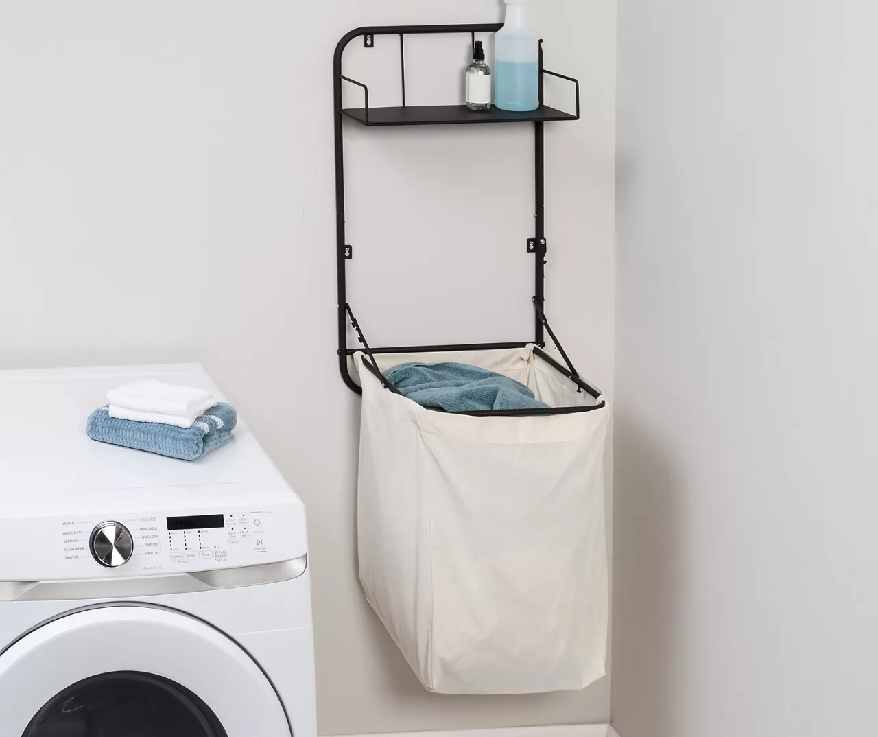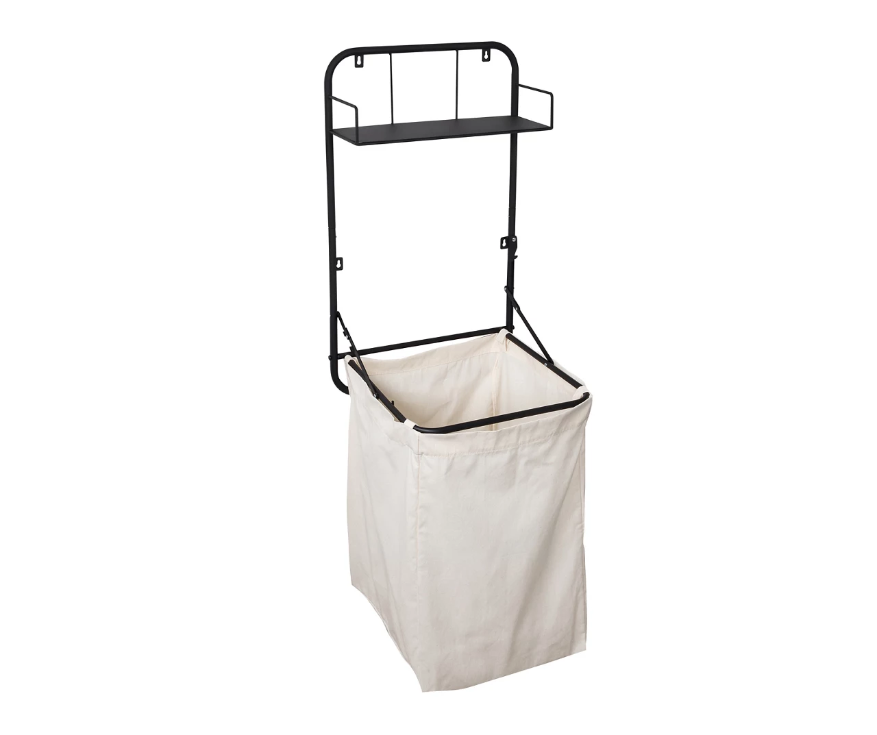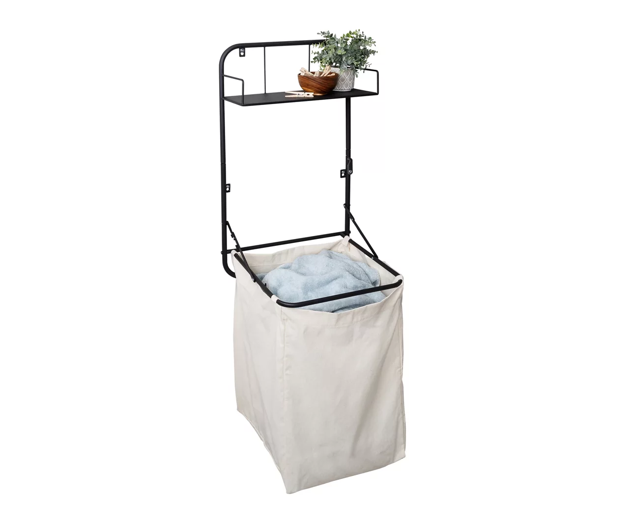 A black powder-coated frame, detachable canvas bag, and metal shelf intertwine to create this chic hamper from Honey-Can-Do. Toss your dirty clothes in the fabric hamper and place your laundry detergents on the top shelf. Or you can harmonize this piece with the rest of your décor by adorning the top shelf with goodies like plants and books for a cozy touch. It comes with hardware to make it a wall-mounted hamper or an over-the-door laundry basket, and its folding design is convenient for small spaces.