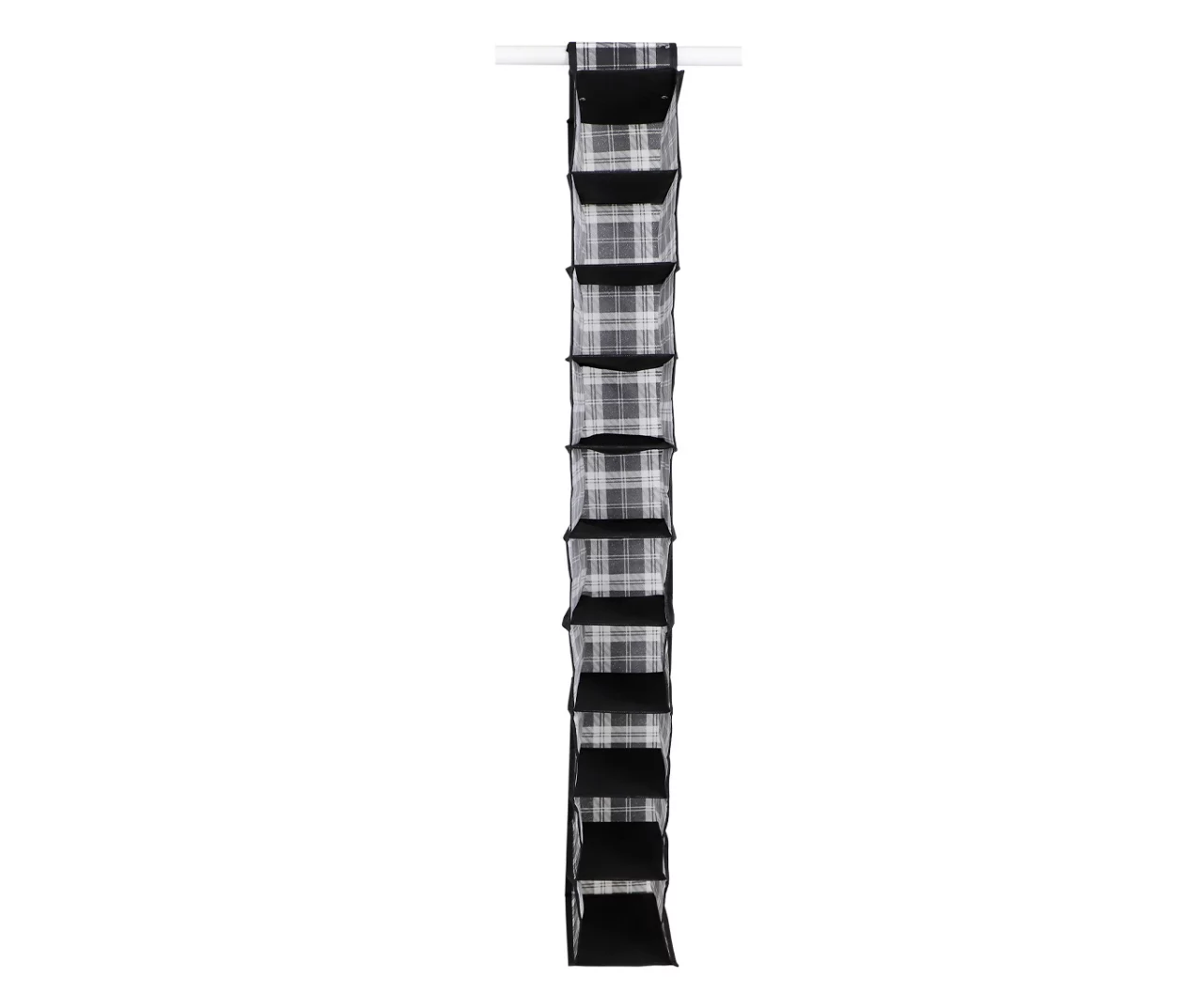 Declutter your closet and maximize your space with the help of this hanging closet organizer from Home Basics. It features sturdy metal hooks that allow you to hang it on most standard closet rods. Simply unfold the organizer to reveal vertically arranged cubbies fit for organizing your entire wardrobe. Use each compartment to stow away folded clothes, accessories or shoes. Constructed from breathable non-woven material, the organizer is gentle on even the most delicate garments. The organizer also folds down into a flat square, allowing you to tuck it away in a drawer or under a bed when you’re done using it.