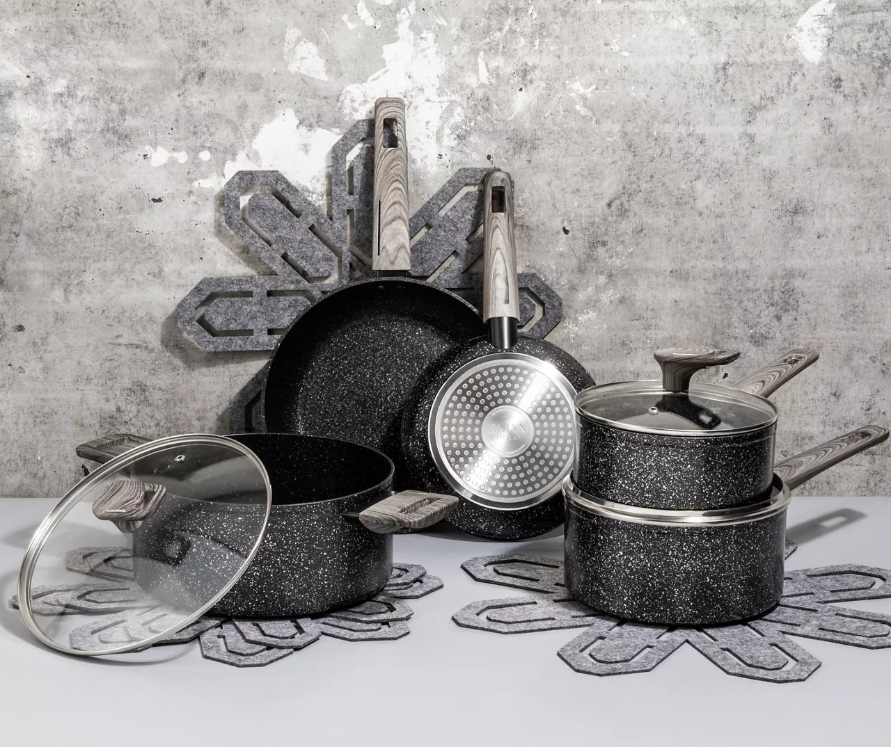 Boasting a sleek and modern look, this gorgeous Solstice cookware set simplifies food prep with fast-heating aluminum construction and speckled nonstick interiors that require less butter or oil. A set of cookware protectors prevent scratching, chipping and sliding when stacking pieces for storage.