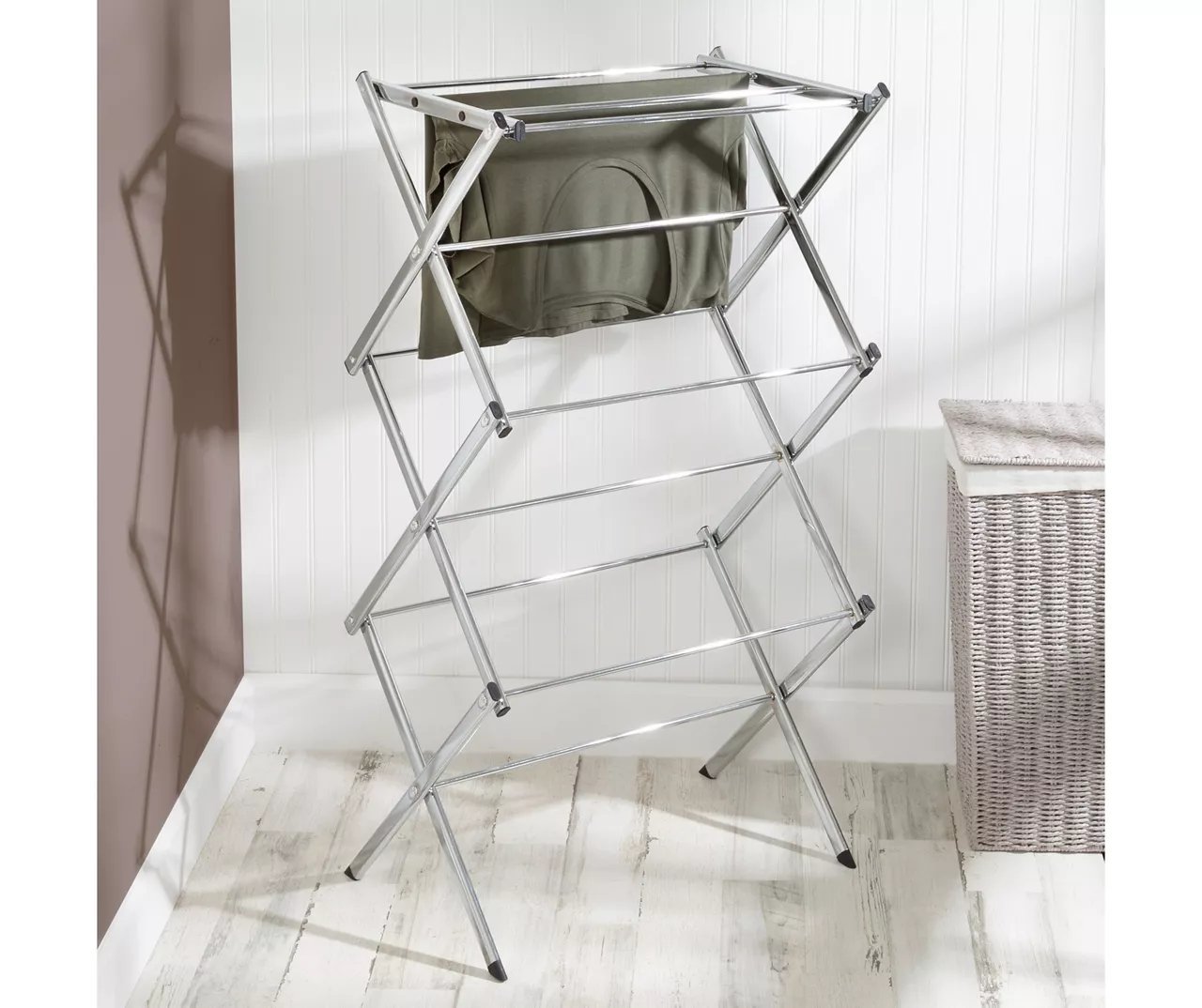 Take a load off your dryer and dry your clothes naturally with this durable and practical drying rack. For indoor or occasional outdoor use, the rack is made from a coated steel frame making it sturdy and rust-resistant. This portable rack can be used anywhere and folds down to 3 inches flat for easy storing. The top tier has 4 cross bars and is ideal for air-drying your wet clothes. With 18-linear feet of capacity to air-dry clothes using minimal floor space, this expandable drying rack is a great space-saver.