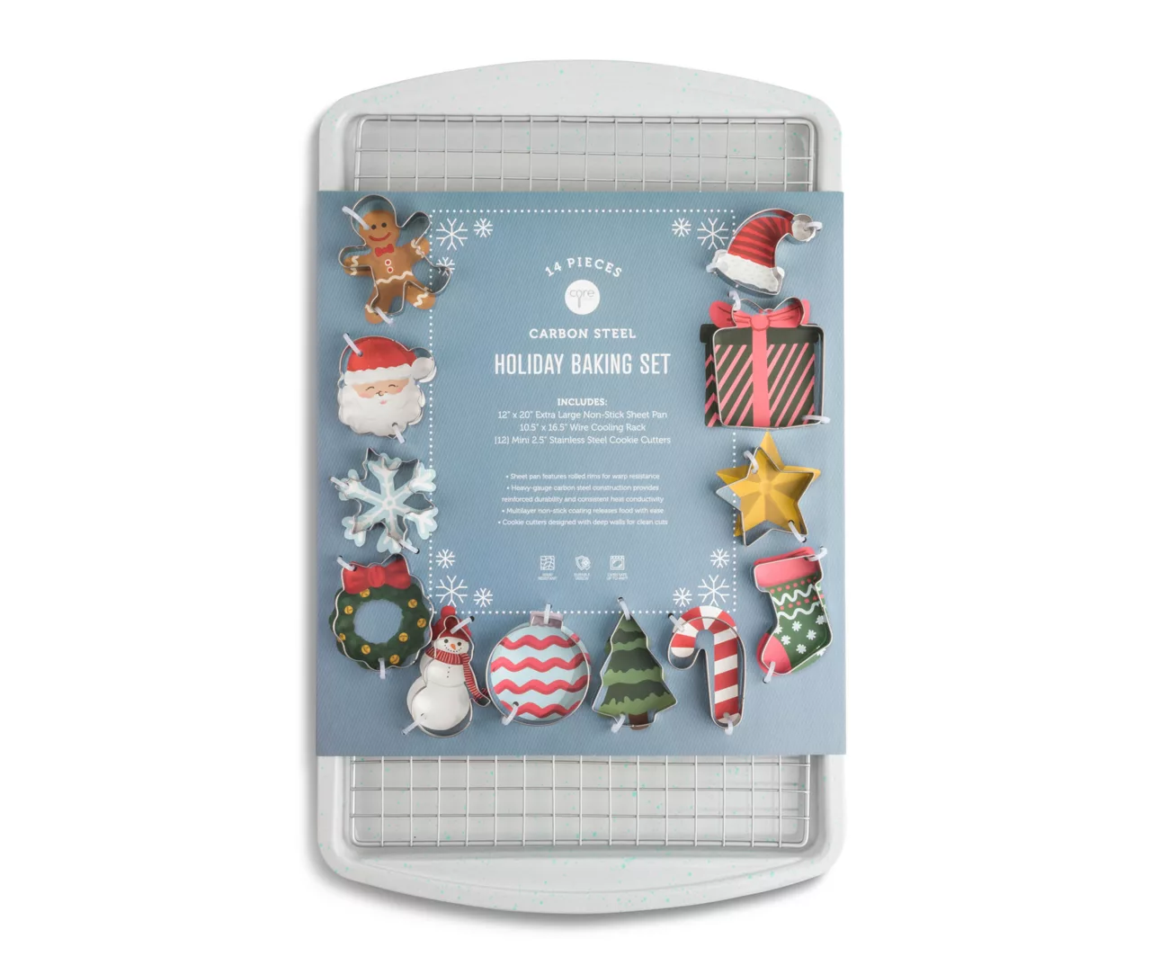 - Includes 12″x20″ baking pan, 10.5″x16.5″ wire cooling rack and 12 mini cookie cutters