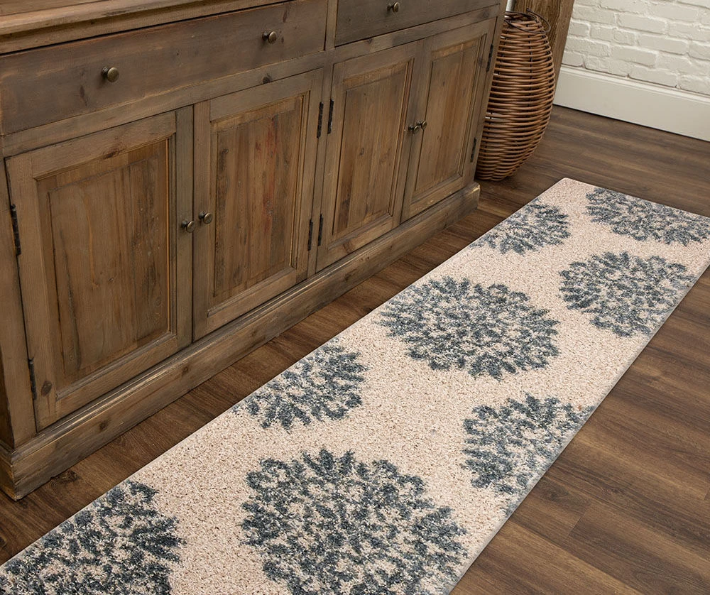 Oversized medallions in cool blue makes a beautiful contrast against neutral tan on this Exploded Medallions rug. It’s a perfect addition in any living or work space to add chic style and soft comfort underfoot.