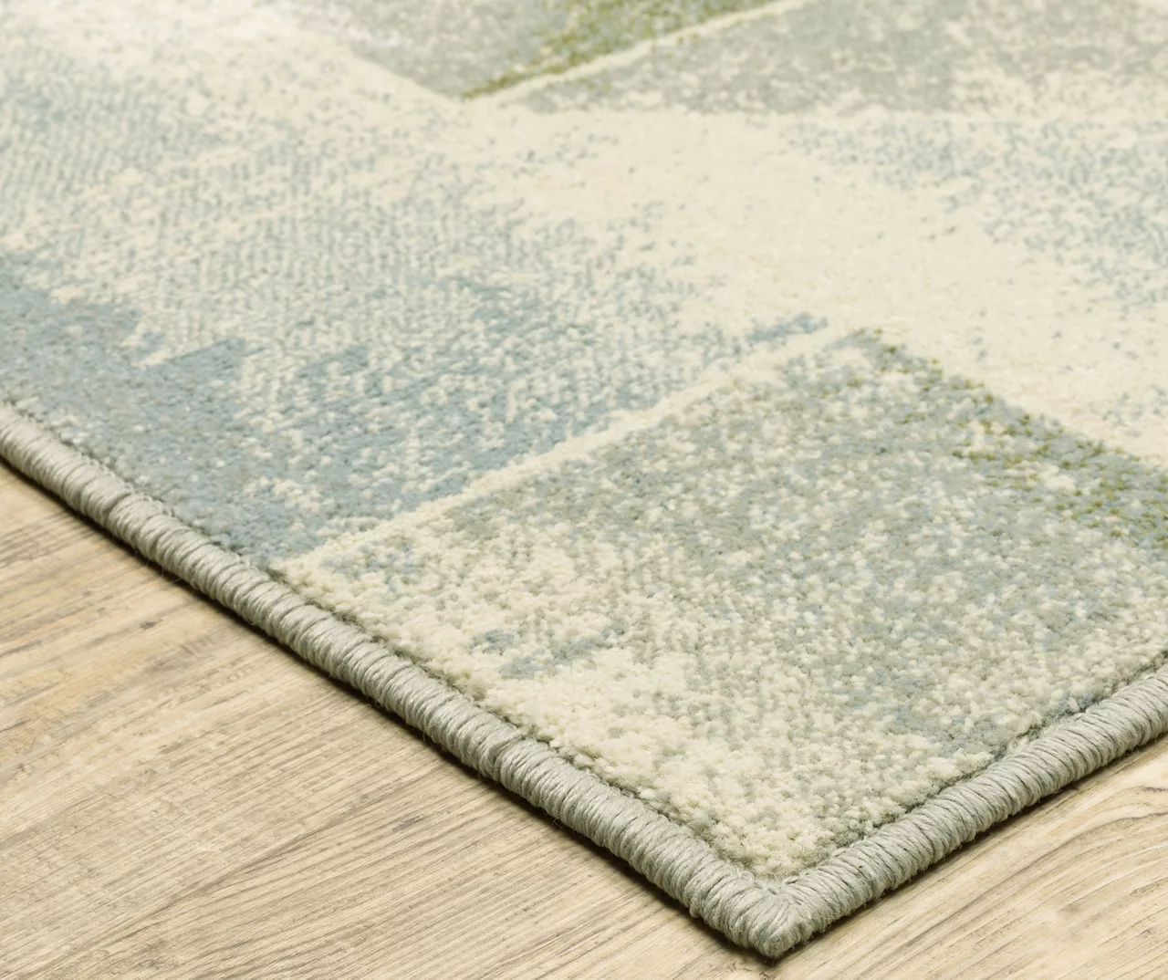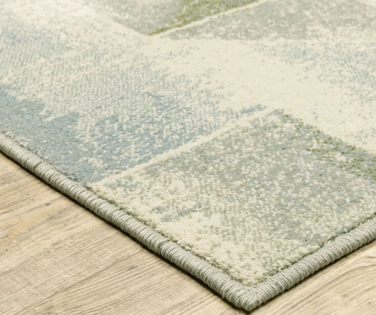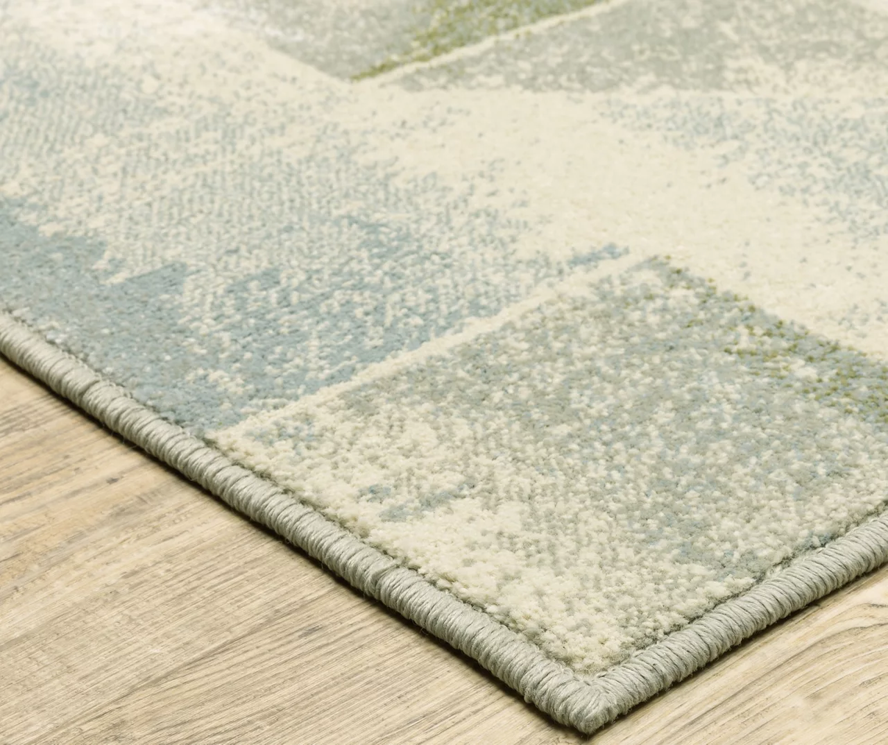 - Contemporary geometric color block design with a distressed look