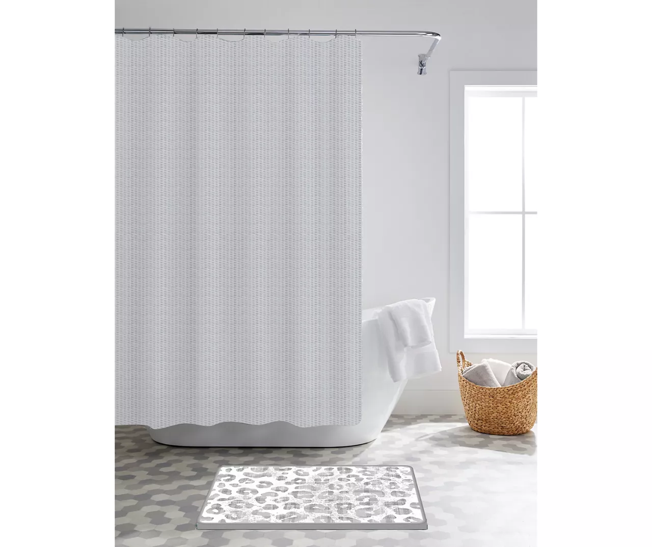 Give your bathroom a modern style refresh with this bath accessory set that comes with a textured shower curtain, 12 rollerbal hooks and plush noodle rug. The highly absorbent pile is soft and features a stripe design, and the rug comes with a non-skid backing to help keep it in place. Both the shower curtain and rug are machine washable, so you can easily keep your bathroom feeling fresh.