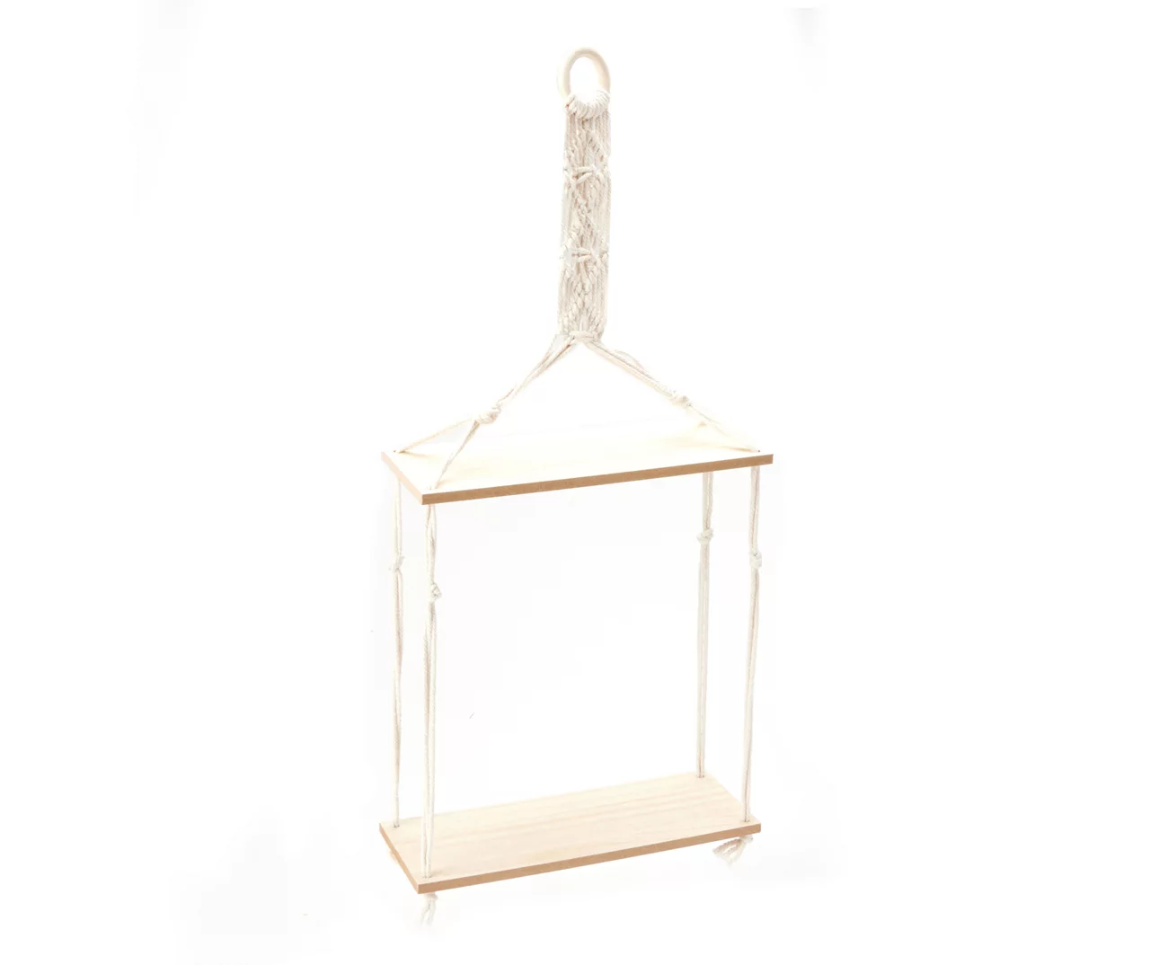 Display your small plants, picture frames and more with the bohemian charm of this macrame hanging shelf featuring a two-tier wood shelf design.