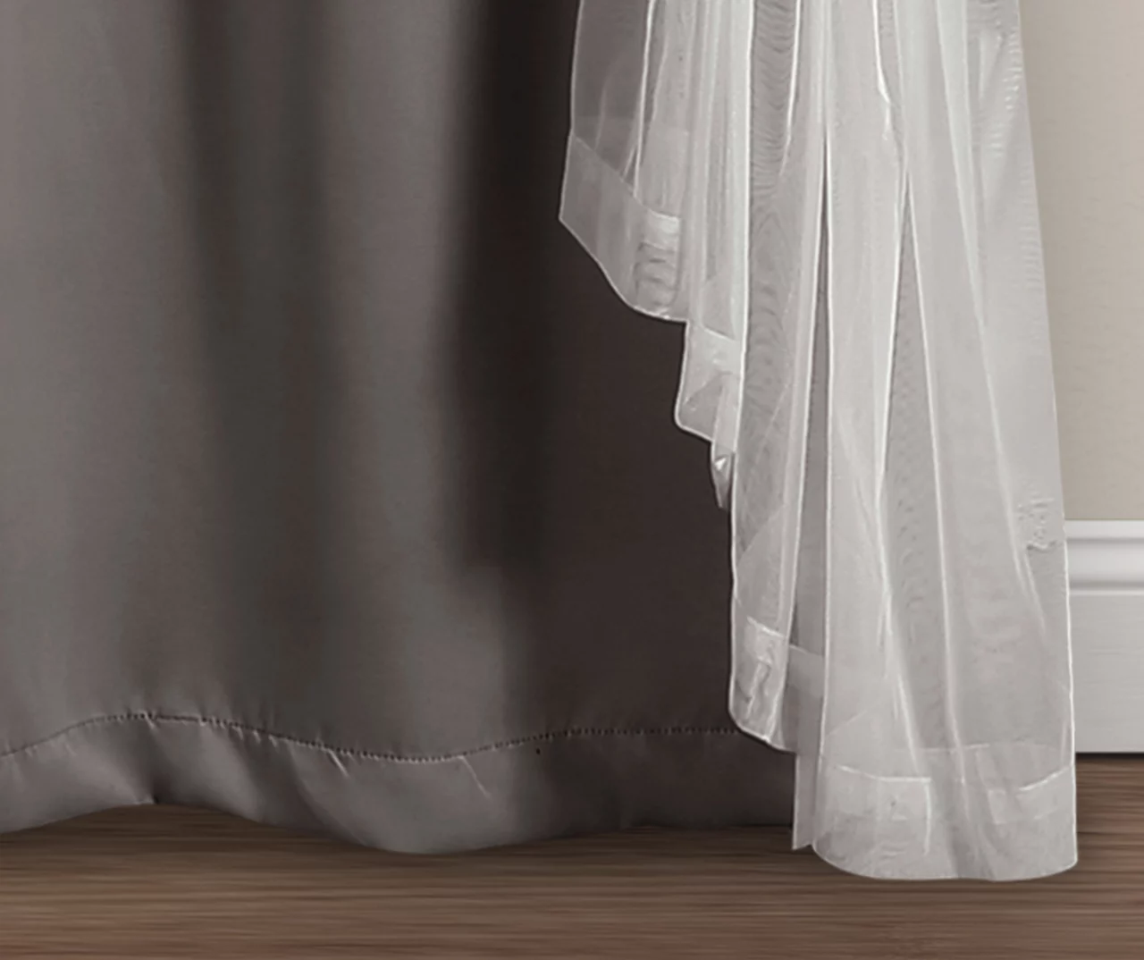 - Neutral dark gray blackout lining with sheer white overlay