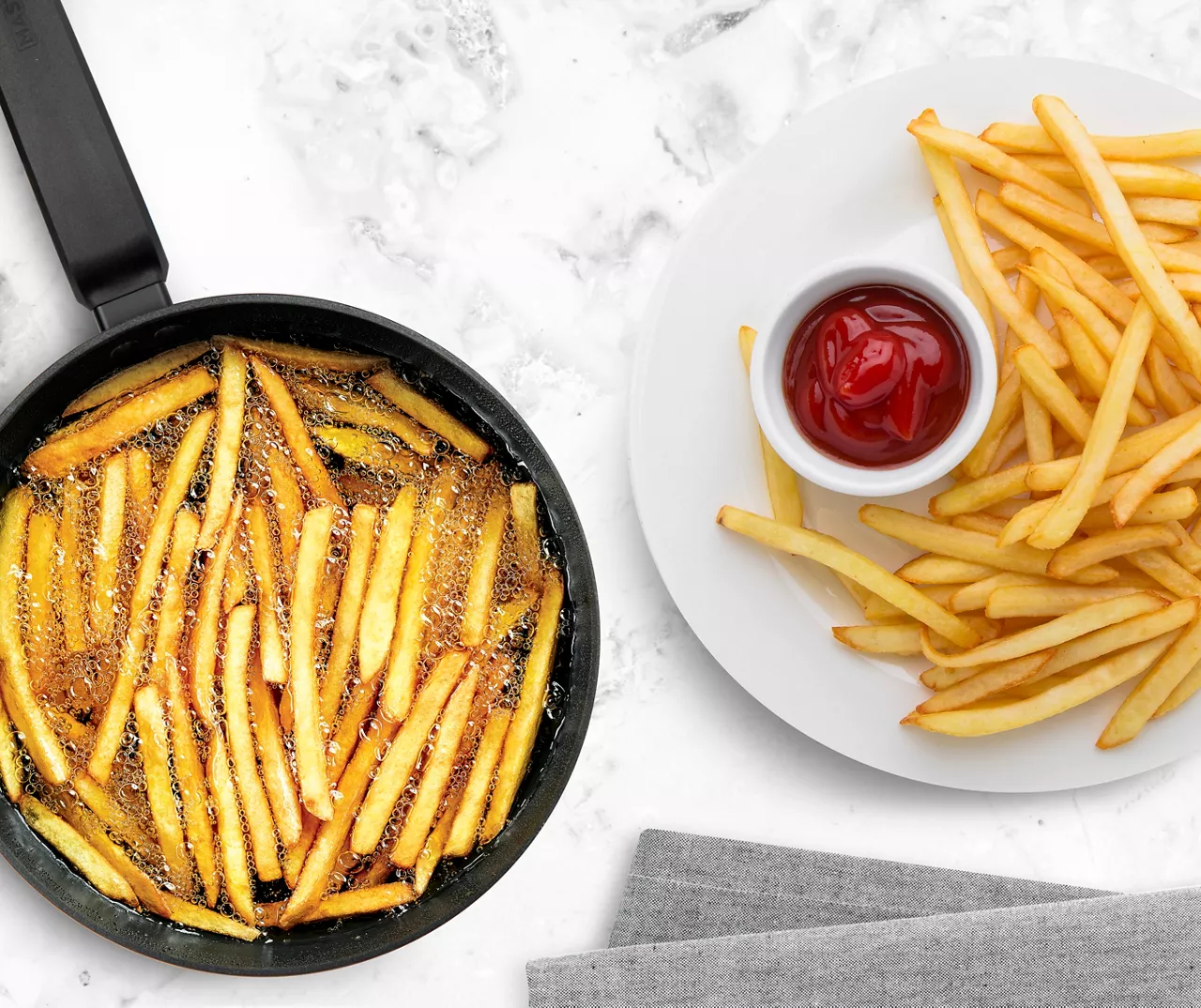 - Cast aluminum fry pan skillet with triple layer non-stick coating