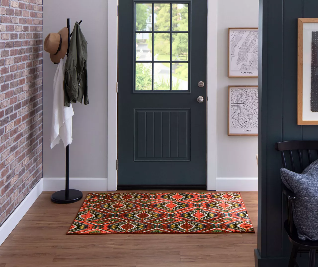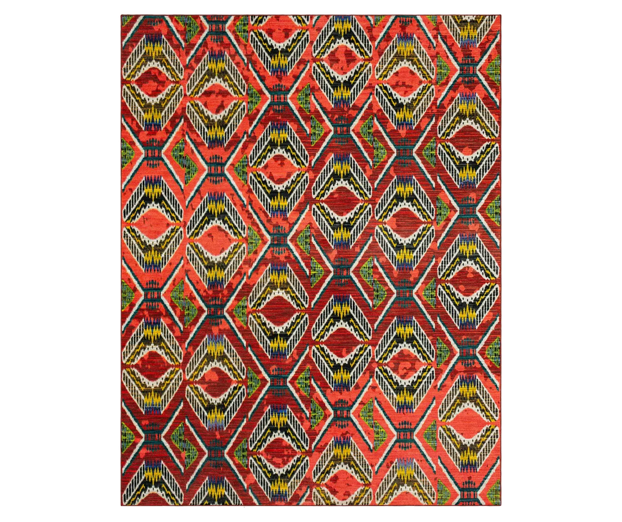 Mohawk Home’s Celinda area rug features a red striated background overlaid with a bold geometric pattern with pops of yellow, green and black. Thoughtfully crafted in the U.S.A. utilizing Mohawk Home’s exclusive precision dye-injected printer, this rug is designed on a plush EverStrandâ„¢ tufted base made from premium recycled polyester. A non-skid latex backing helps to keep things in place, and the low pile is durably designed to easily work with doorways or furniture while withstanding everyday use.