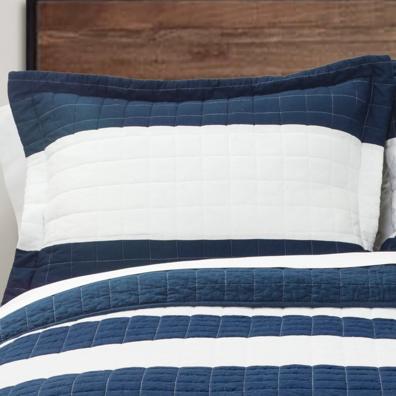 Bold color blocking in navy and white hues gives your sleep space modern style that’s sure to stand out in this cozy quilt set. The breathable cotton construction keeps you warm and comfy through the night