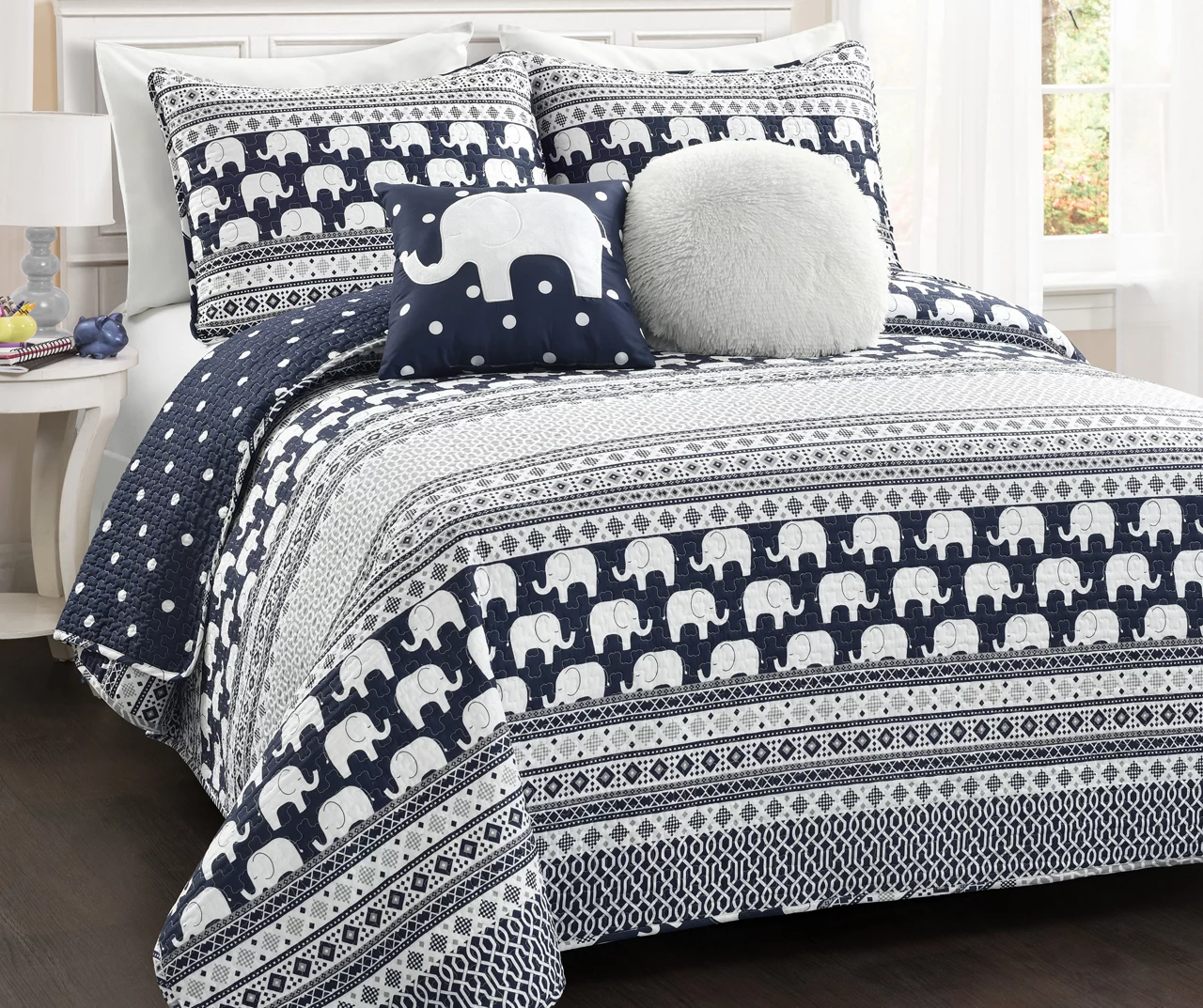 Beautify the bedroom with boho vibes when you add this plush and cozy bedding set featuring an eclectic mix of prints and patterns arranged in a color block design in deep navy and bright white. A matching decorative pillow flaunts an elephant applique on a polka dot background for a dash of safari style, and the round accent pillow delivers soft texture thanks to its lush faux fur construction.