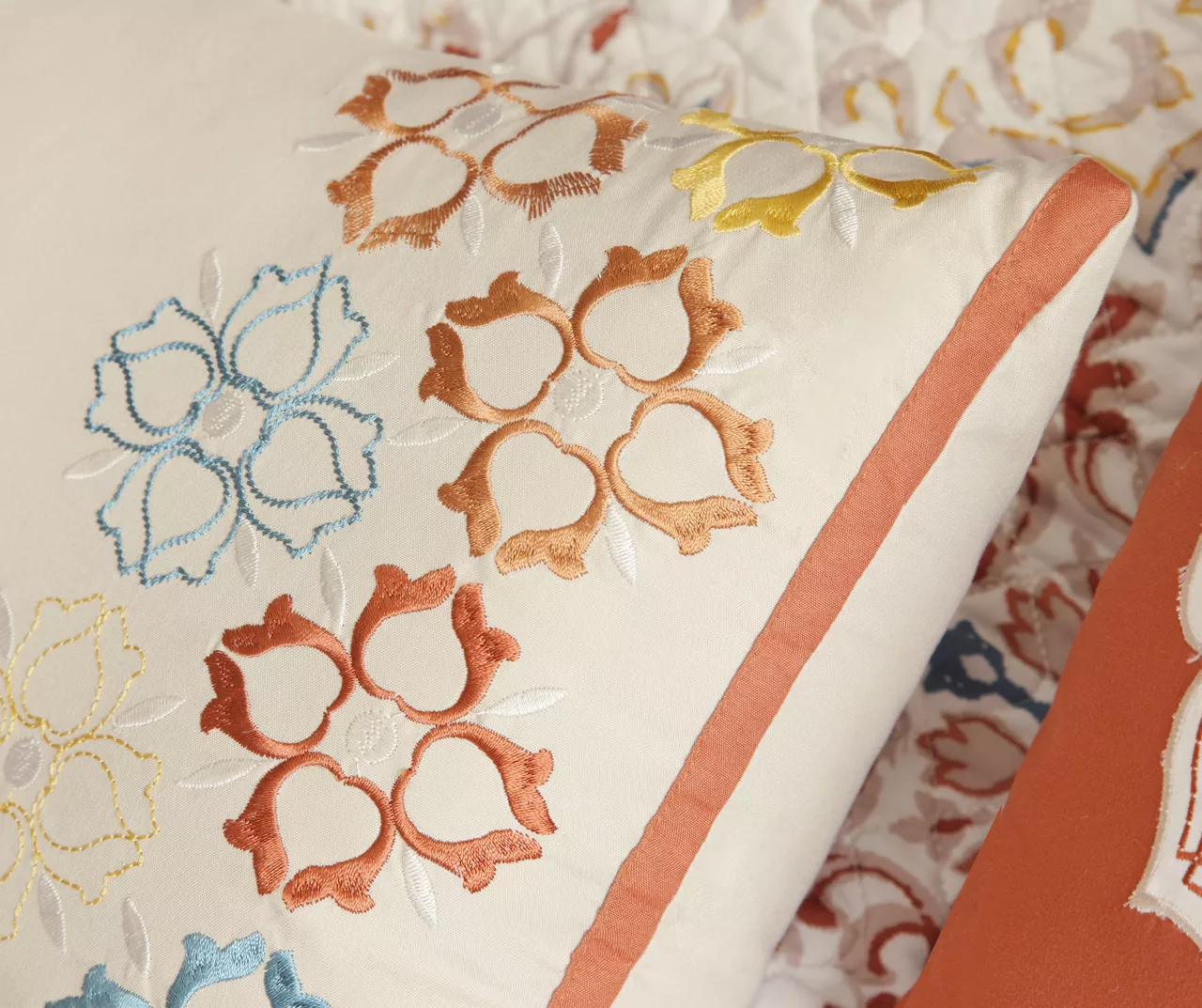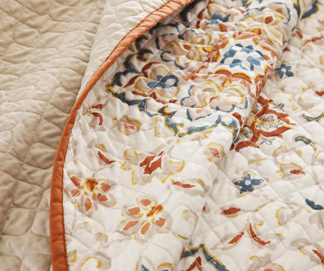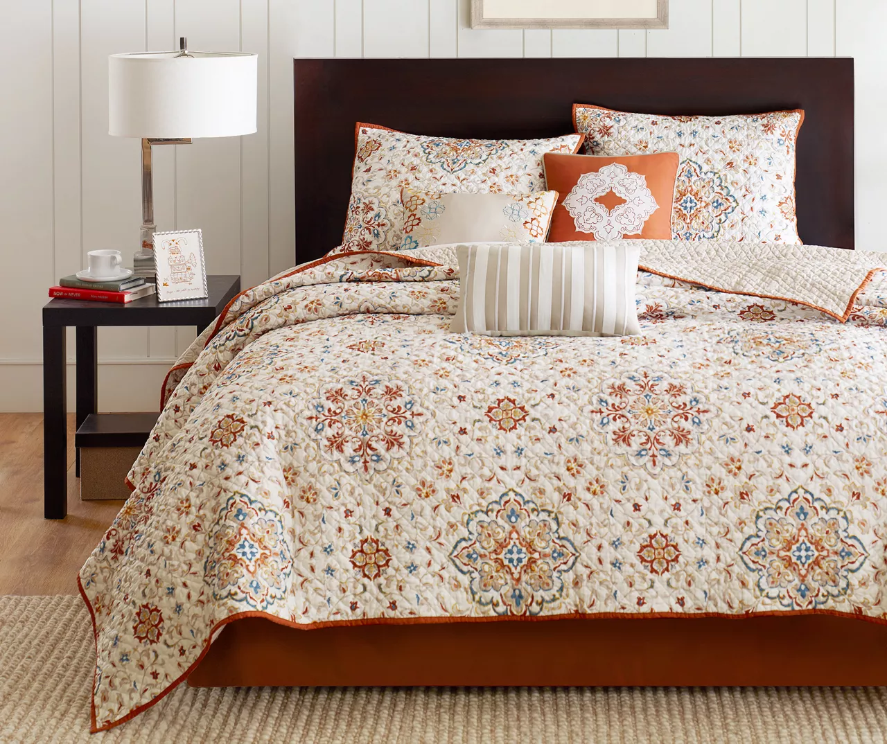 Update your bedroom with a fresh new look in this six-piece reversible coverlet set. Neutral colors and pops of rusty orange are printed on polyester microfiber for a soft hand feel on the face, while the reverse is a solid ivory brushed polyester fabrication. Three decorative pillows feature embroidery and piecing details to add dimension and a pop of details to your bed.