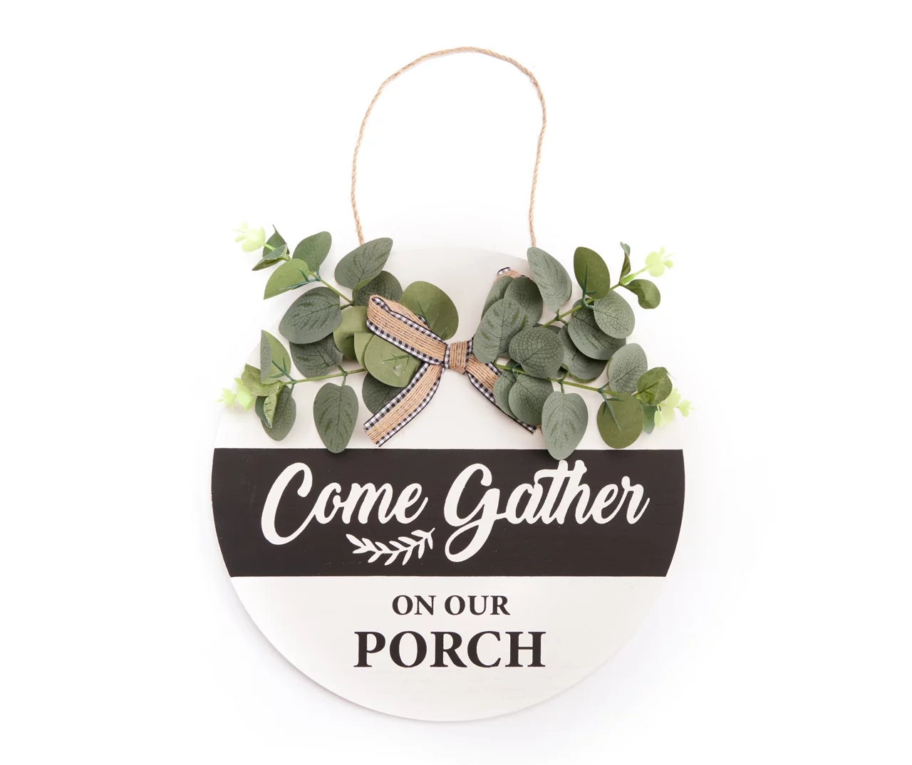 Greet those that visit your home with this rustic-inspired sign. “Come Gather On Our Porch” is written in stylized scripts on a white round sign with a black banner. Accented with faux greenery and a bow, this sign is perfect for displaying next to your front or back door.