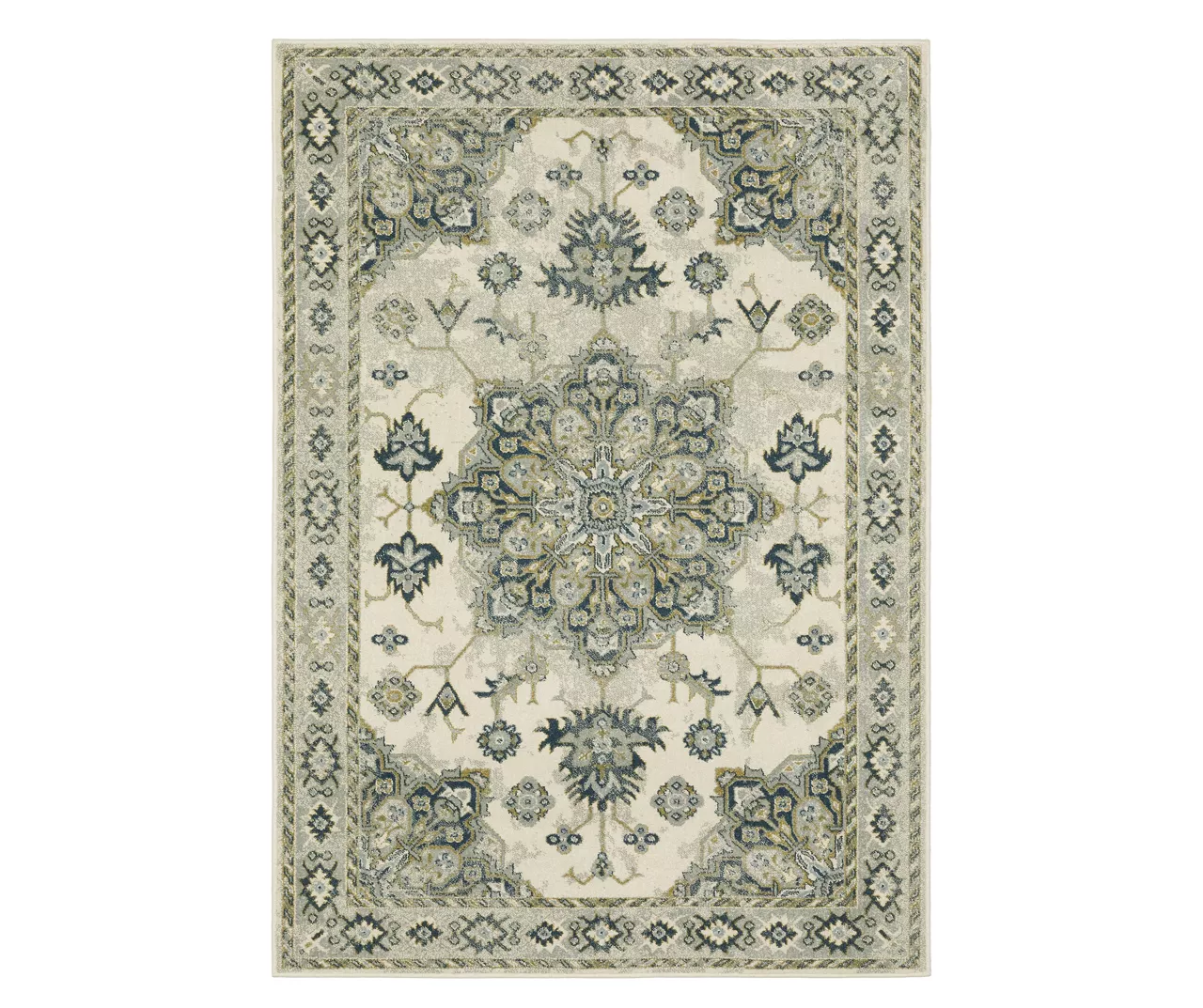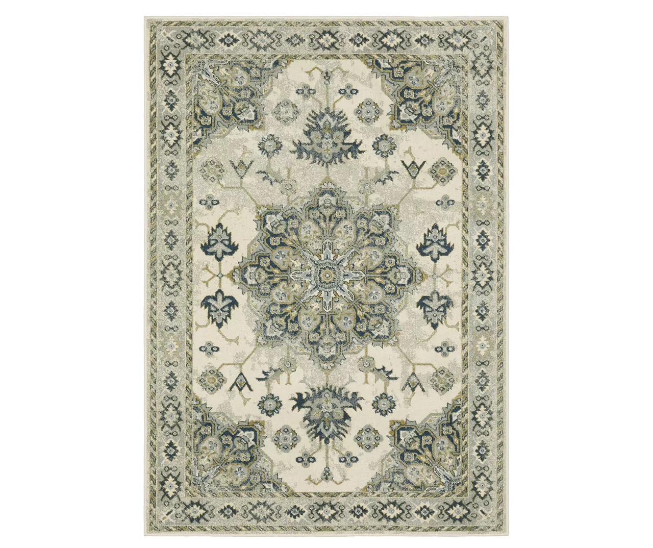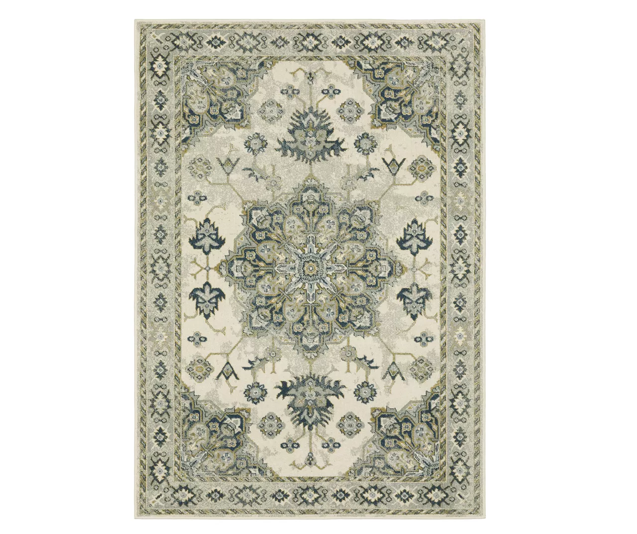The Pamona collection is power-loomed in the USA from tri-colored and textured polypropylene yarn. It features a traditional geometric medallion design in beautifully updated, yet classic colors of deep navy, cool soft blue, moss green and light beige. The multi-colored yarns add depth and visual interest to the designs and the textured effect creates a very soft feel underfoot.