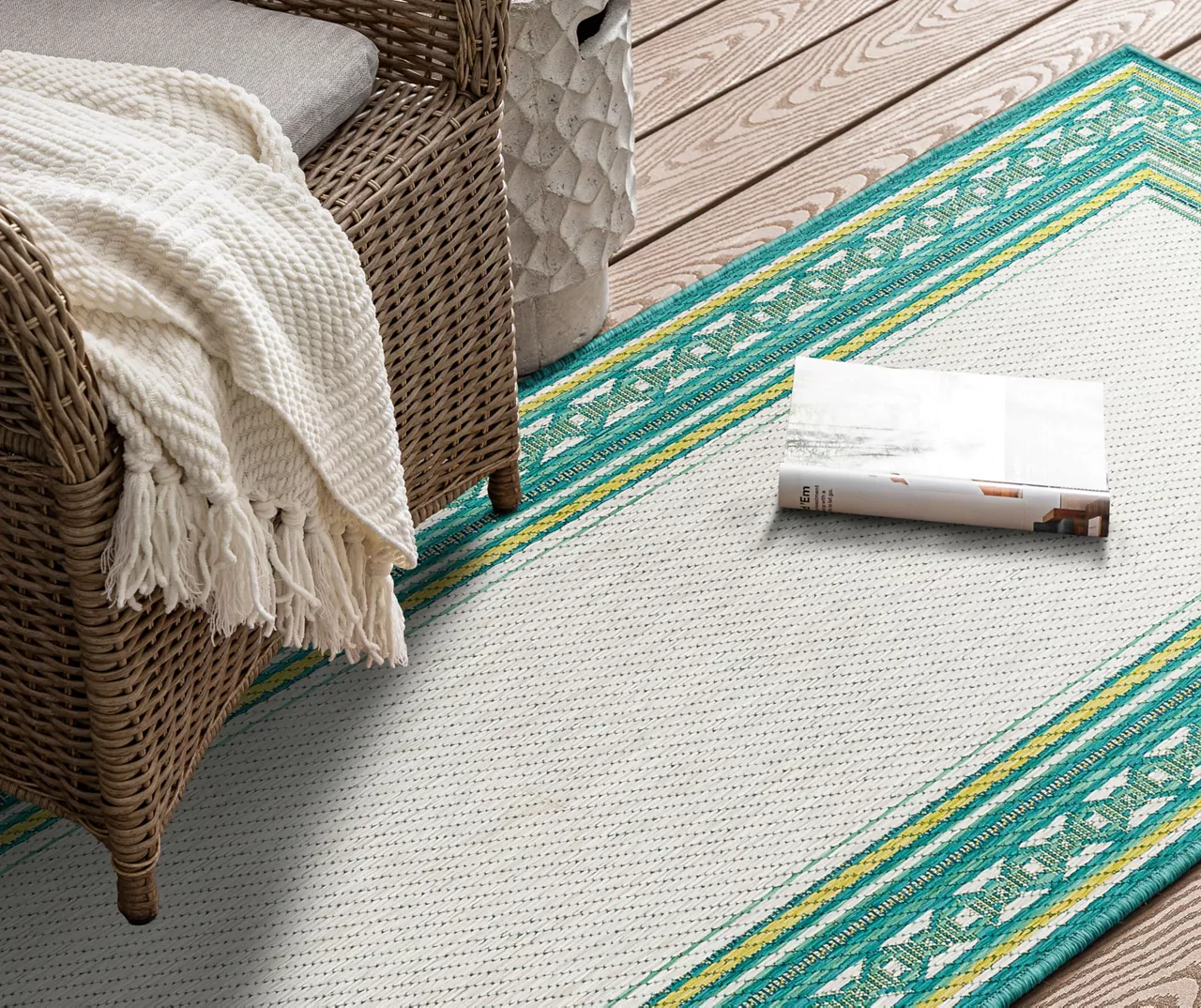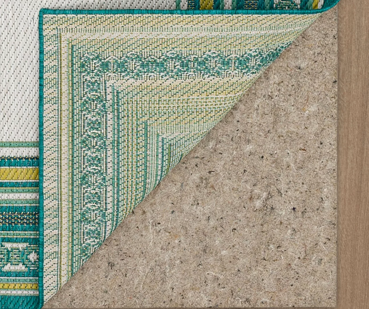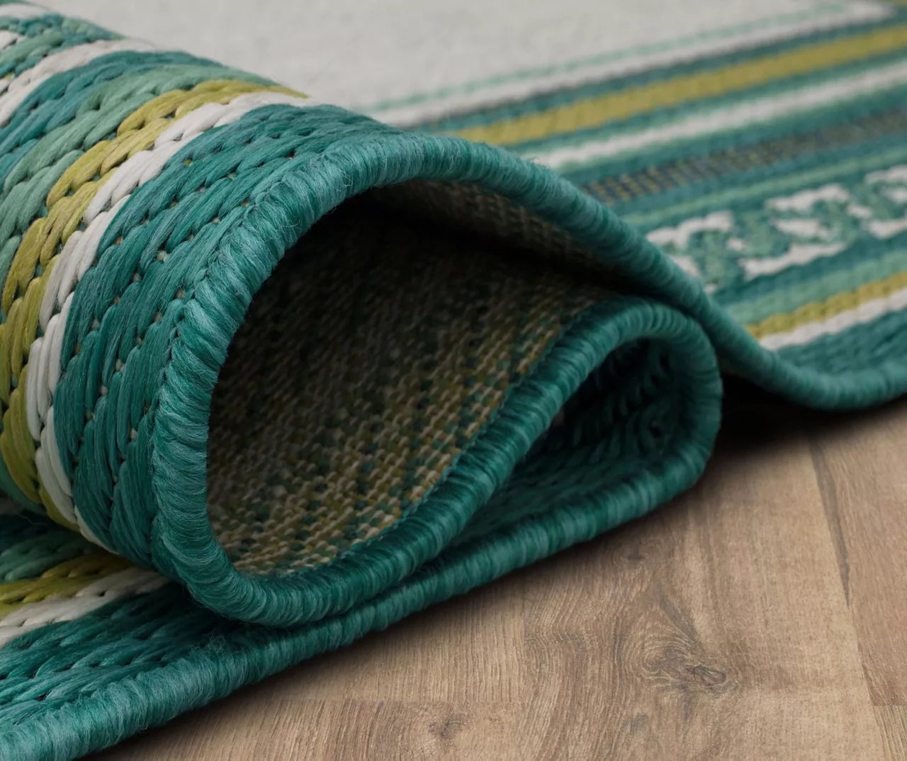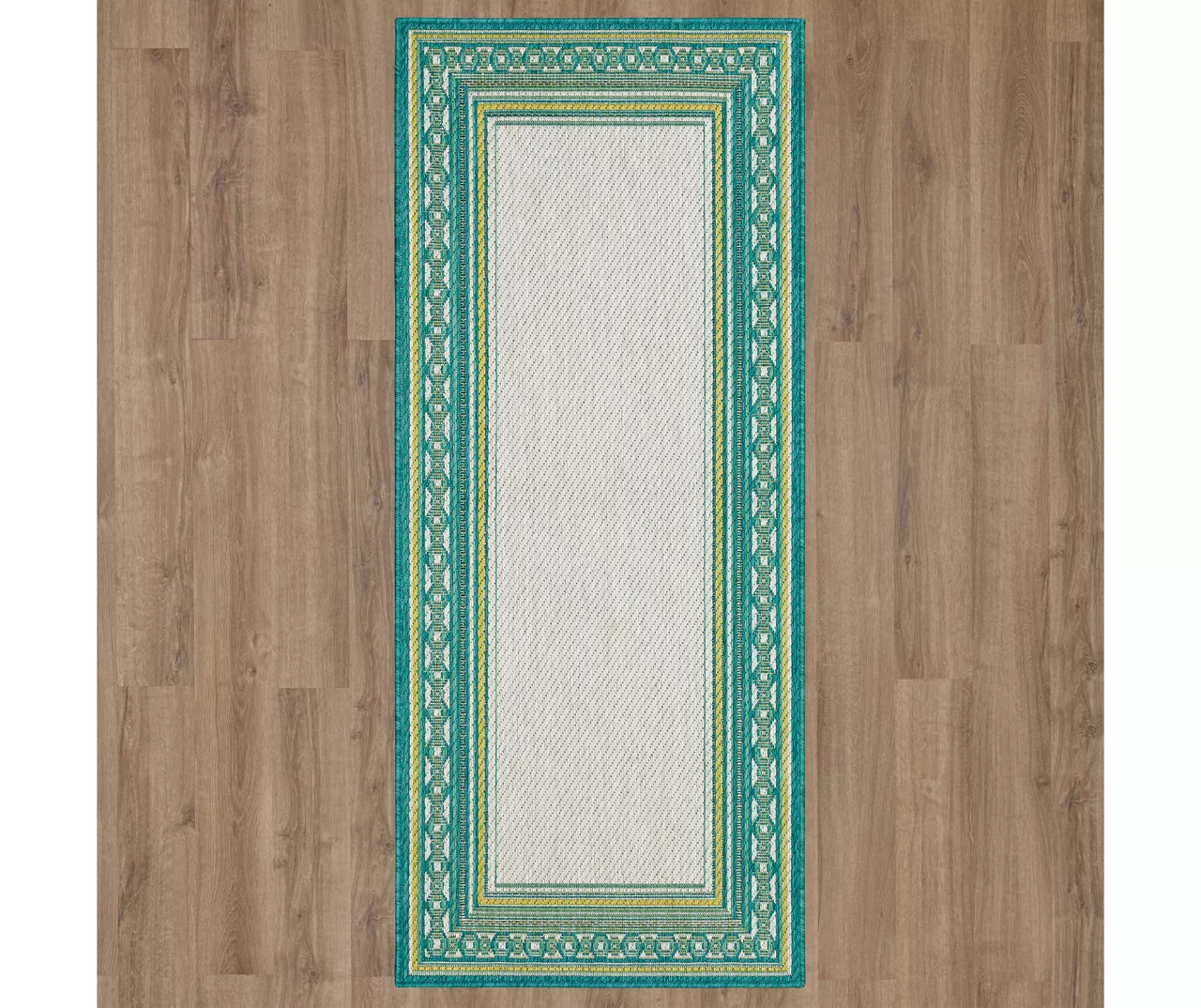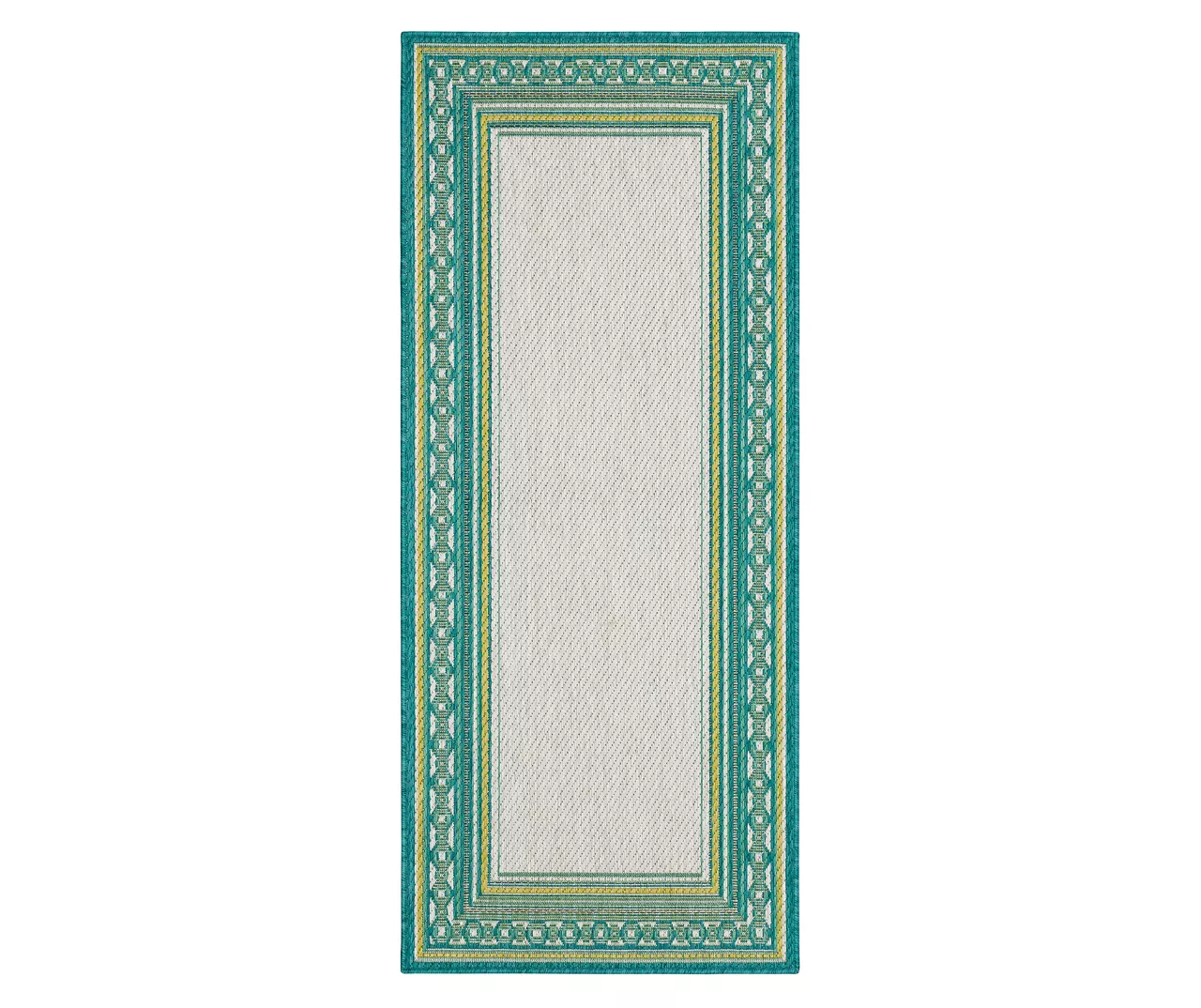 The Mohawk Home Panama area rug features a geometric border design in a palette of teal, green and white for a pop of color on your floors. Made with all-weather olefin polypropylene yarn, this flatwoven area rug offers a detailed design, soft feel and dependable durability that works in both indoor and outdoor spaces. The resilient surface fiber offers moisture, stain and fade resistance, making it a great choice for high-traffic areas.