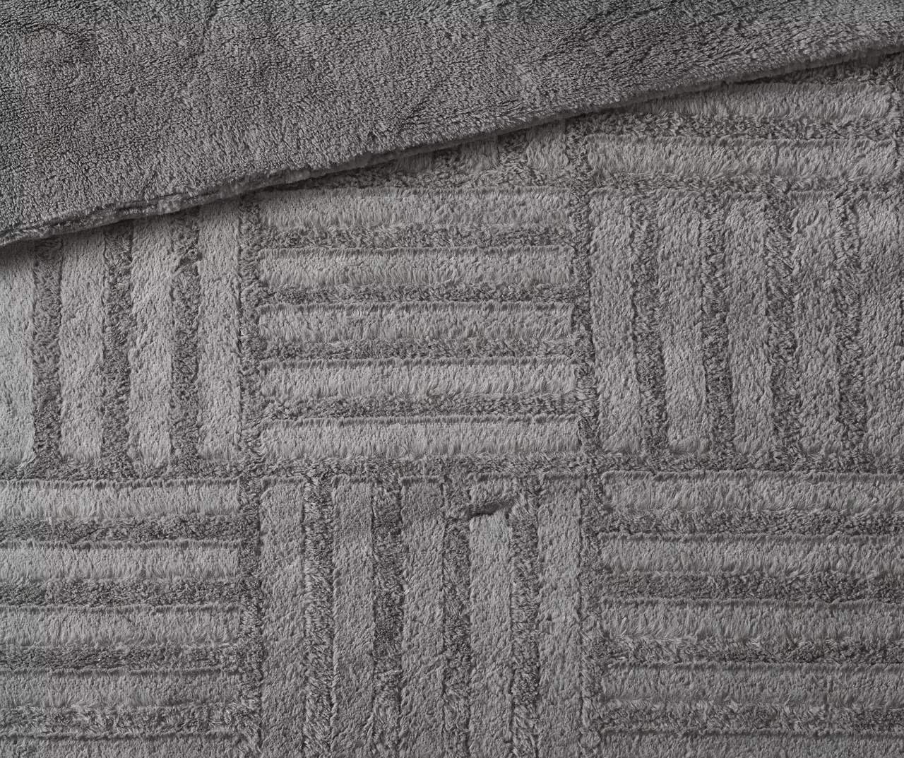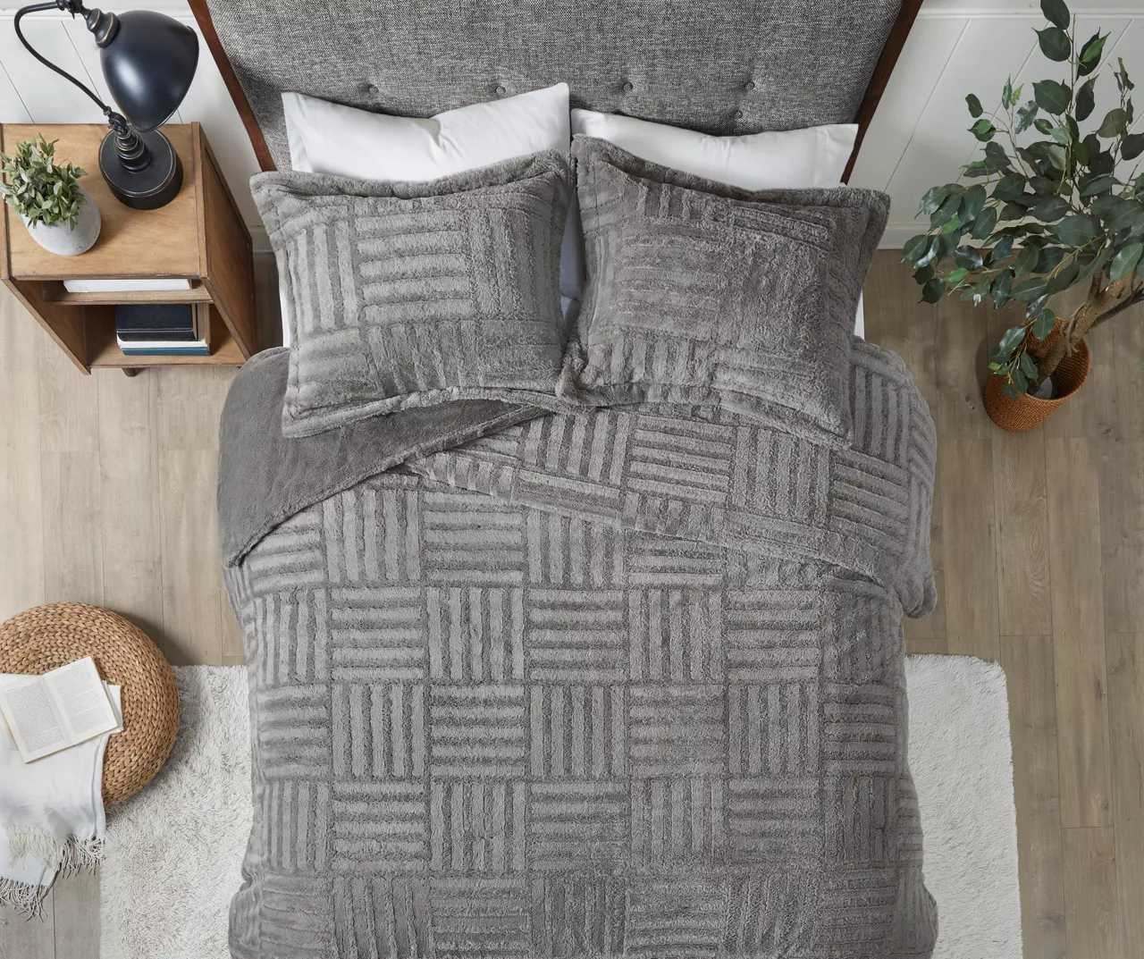 - Material: Comforter: Checkboard brushed faux fur face, solid faux fur reverse, down alternative fill, jump tack Sham: Checkboard brushed faux