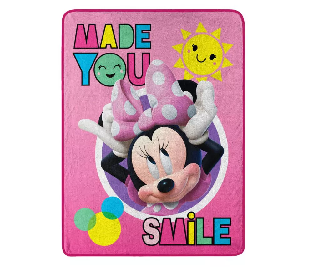 Young Disney fans can stay cozy through adventures both near and far (and right at home on the couch) with this delightful throw crafted from soft micro polyester fabric. A pink Minnie Mouse motif with a “made you smile” message brings cheerful charm to this warm layer.