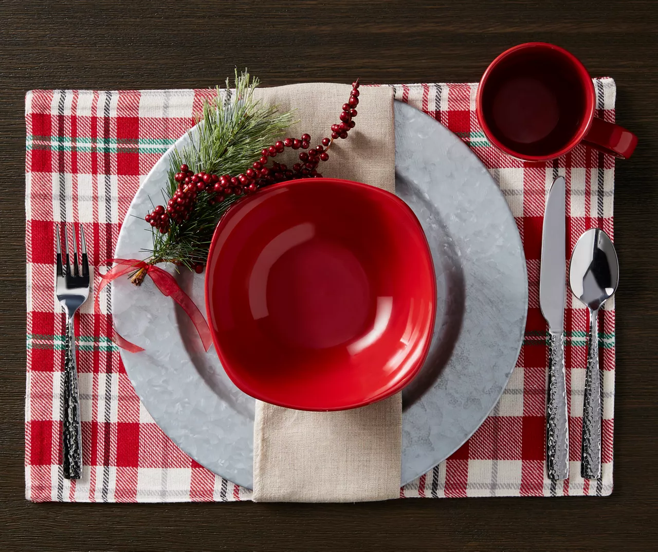 Serve your friends and family on a dinnerware set as elegant as your next meal. The glossy red detail and contrasting black finish will add charm to any table. Set contains four place settings.
