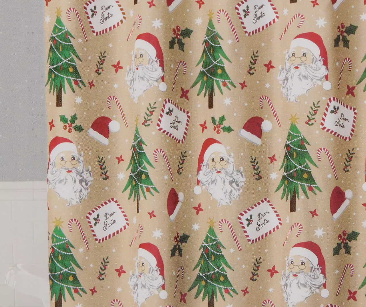 - Allover pattern with Santa’s face, a letter to Santa, candy canes, holly and trees