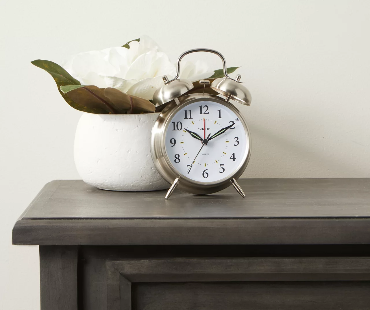 Wake up on time and stay punctual with this classic style alarm clock. Features a highly accurate design, easy-to-read Arabic numerals and an all-metal case with a brushed nickel finish.