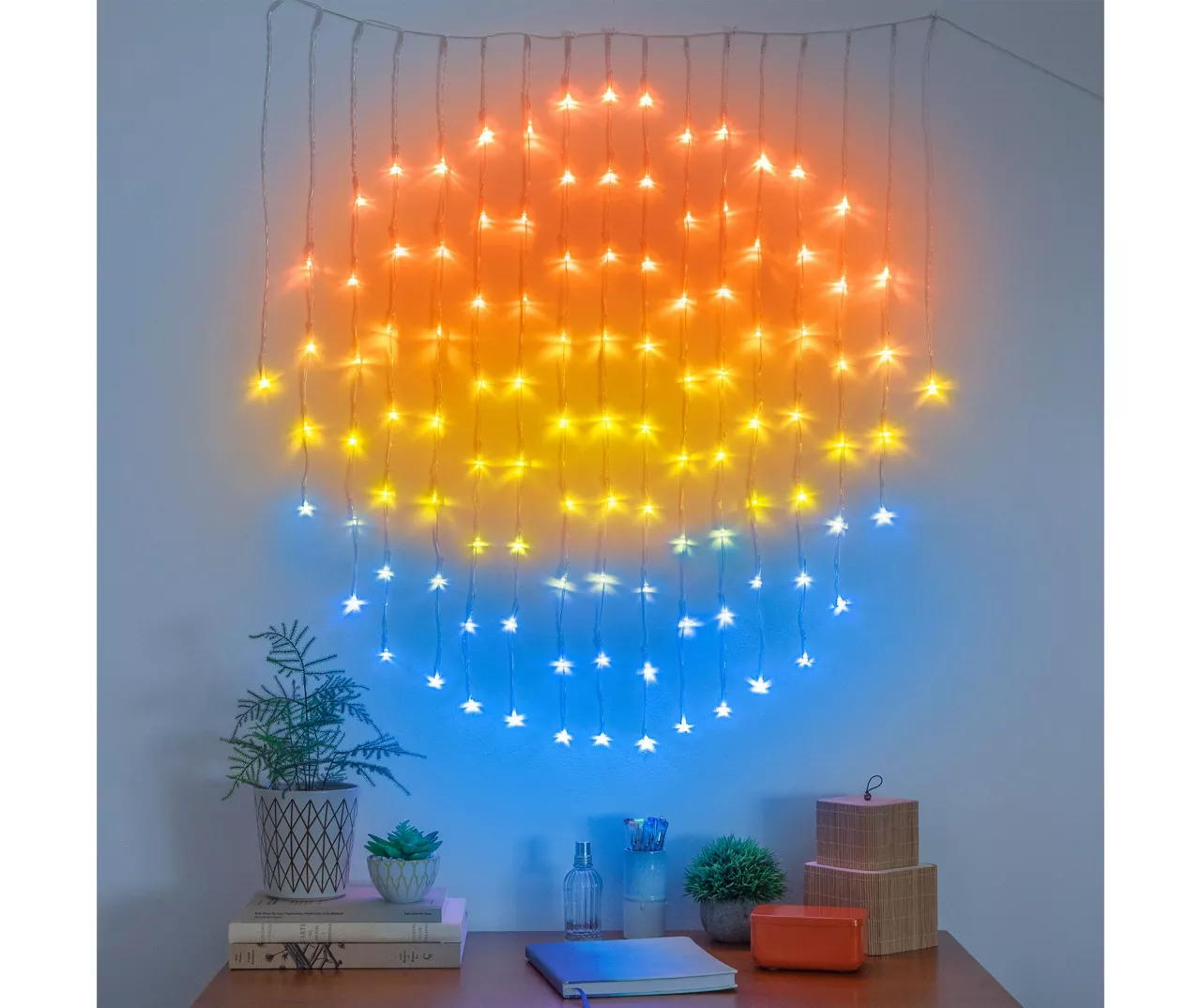 - Orange, yellow and blue sunset-themed light colors